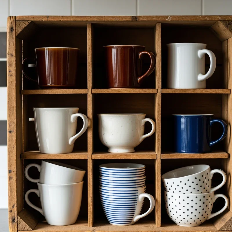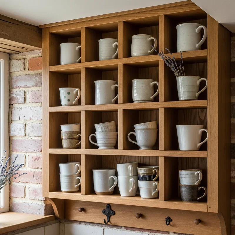 Create a permanent solution with custom-built cubbies designed specifically for your mug collection! Built-in cubbies can be incorporated into existing cabinetry or added during kitchen renovations. Each compartment holds one or two mugs, preventing stacking and making selection effortless. Design cubbies in various sizes to accommodate different mug dimensions, from petite espresso cups to oversized latte bowls. The individual compartments protect mugs from chips and scratches while creating an organized, boutique-like display. Consider adding LED strip lighting to illuminate each cubby, highlighting your collection and making early morning selection easier. This solution works particularly well in breakfast nooks or coffee stations, creating a dedicated space that elevates your daily coffee ritual.