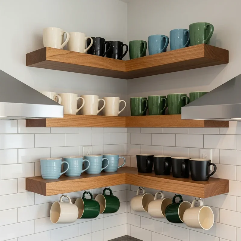 Make those awkward corner spaces work harder with custom floating shelves designed specifically for mugs! Corner areas often go unused, but strategic shelving can transform them into prime storage real estate. Install two or three tiers of corner shelves at comfortable reaching height, creating a dedicated mug display that doesn't intrude on your workspace. Choose materials that complement your kitchen, from sleek glass to warm wood or modern acrylic. The floating design keeps the area feeling open and airy while providing substantial storage. Arrange mugs by color or size for a visually pleasing display that doubles as decor. Add under-shelf lighting to highlight your collection and make early morning mug selection easier.
