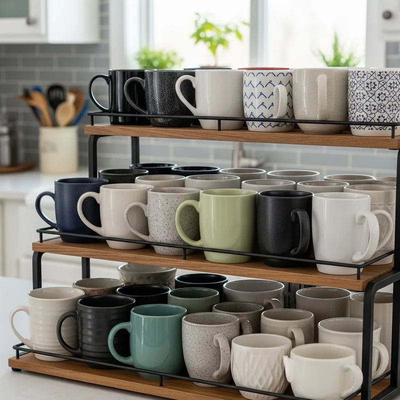 Think vertically with tiered shelf organizers that maximize your cabinet's height! These stepped platforms create multiple levels within a single shelf, allowing you to see and access every mug without the dreaded domino effect. Available in materials ranging from bamboo to acrylic, these organizers fit most standard cabinets and instantly double or triple your storage capacity. The tiered design means no more forgotten mugs lurking in dark corners. You can arrange mugs by size, color, or frequency of use, creating a system that actually makes sense for your daily routine. Some models even expand to fit different cabinet widths, making them a versatile solution for renters who can't make permanent modifications.