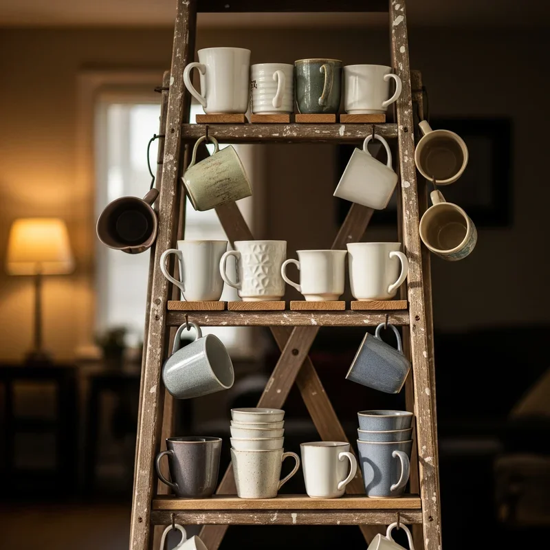 Got an old ladder gathering dust? Transform it into a trendy mug display that'll have guests asking where you bought it! Lean a vintage wooden ladder against the wall or mount it horizontally for a unique storage solution. Each rung becomes a perfect perch for mug handles, creating an eye-catching vertical display. Sand and paint or stain the ladder to match your kitchen's aesthetic, whether that's shabby chic, industrial, or modern minimalist. This solution works especially well in kitchens with high ceilings or narrow wall spaces. Add S-hooks to the rungs for extra versatility, allowing you to hang mugs at different heights. The ladder's rustic appeal makes it a conversation starter while solving your storage dilemma.