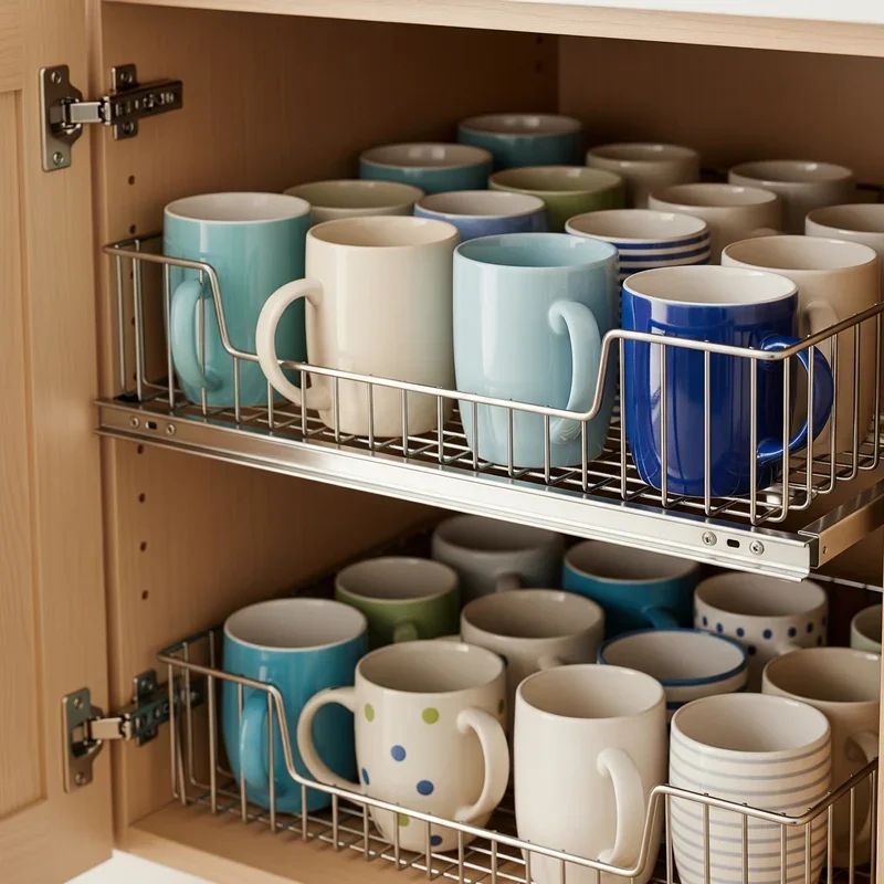 Maximize deep cabinet space with sliding wire baskets that make every mug easily accessible! These baskets attach to cabinet frames and glide smoothly on tracks, bringing back-row mugs forward without disturbing others. The open wire design provides visibility from all angles, helping you quickly locate specific mugs. Install multiple baskets at different heights to accommodate various mug sizes, from delicate teacups to hefty soup bowls. The baskets' removable nature makes cleaning simple, and their durability ensures years of smooth operation. This solution particularly benefits lower cabinets, eliminating the need to crouch and dig through stacked mugs. Consider adding drawer dividers within baskets to prevent mugs from sliding during movement.