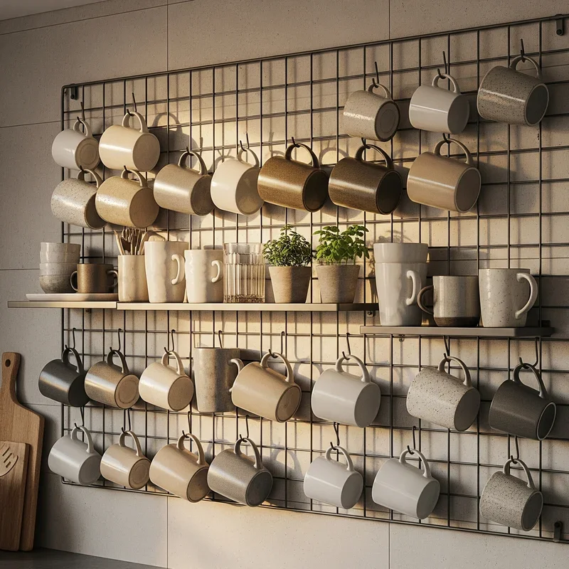 Industrial chic meets practical storage with metal grid organizers that turn blank walls into functional art! These wire grids, often used in retail displays, offer endless customization possibilities for your mug collection. Mount one or several grids to create a coffee corner that's both stylish and space-saving. Add hooks, baskets, and shelves wherever needed, adjusting the configuration as your collection grows. The open design keeps everything visible and accessible while adding an urban edge to your kitchen decor. Spray paint the grid to match your color scheme or leave it in classic black for a bold statement. This solution works especially well in small kitchens where every square inch counts.