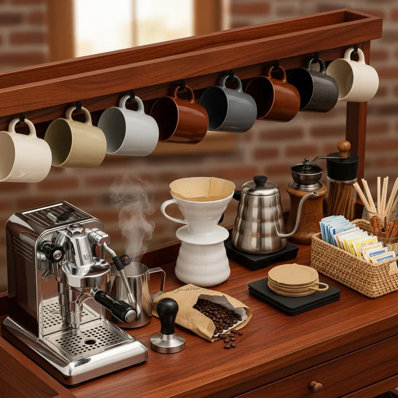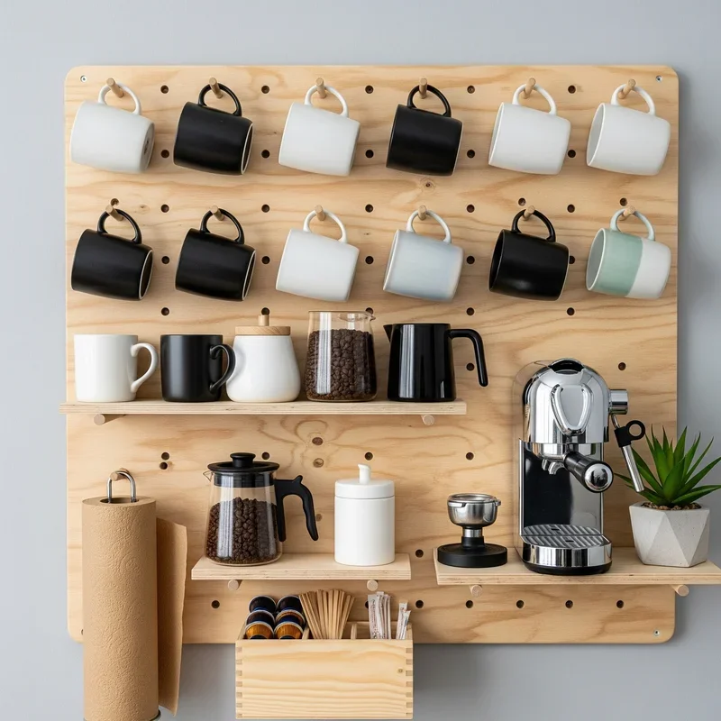 Who says pegboards are just for garages? A stylish pegboard can become your kitchen's most functional feature! Paint it to match your decor, then arrange hooks, shelves, and baskets to create a customized coffee station. This versatile solution grows with your collection since you can easily rearrange components as needed. Mount it on an empty wall near your coffee maker, and suddenly you've got a dedicated space for mugs, coffee supplies, and even small plants. The pegboard's flexibility means you can adjust hook spacing for different mug sizes, from tiny espresso cups to oversized soup mugs. Add some LED strip lighting behind it for a modern cafe vibe that'll make your kitchen feel like a trendy coffee shop.