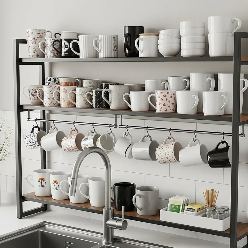 That empty space above your sink holds untapped storage potential! Over-the-sink shelves create additional storage without sacrificing counter or cabinet space. These shelves come in various styles, from simple wire designs to elaborate wooden structures with multiple tiers. Position mugs on these shelves for easy access while washing dishes or filling the coffee maker. The location keeps mugs conveniently close to water sources while freeing up prime cabinet real estate for other items. Choose a shelf depth that doesn't interfere with faucet operation or window access. Some designs include hooks underneath for hanging mugs, doubling your storage capacity. The elevated position also showcases decorative mugs, turning functional storage into an attractive display.
