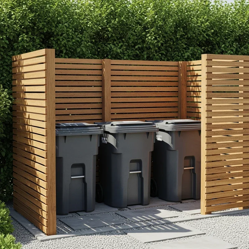 If contemporary design speaks to your soul, then horizontal slat screens are calling your name. These sleek barriers create clean lines that complement modern architecture while providing complete privacy for your bins. Using composite materials or treated wood, you can build panels that look like they cost thousands but actually come in under $300. Space the slats about an inch apart for airflow, or go tighter for maximum concealment. The horizontal lines actually make your yard appear wider, which is a neat optical illusion bonus. Weather-resistant stains in gray, black, or natural wood tones keep maintenance minimal while ensuring your storage solution looks fresh year-round. This isn't just garbage storage; it's practically architectural art.
