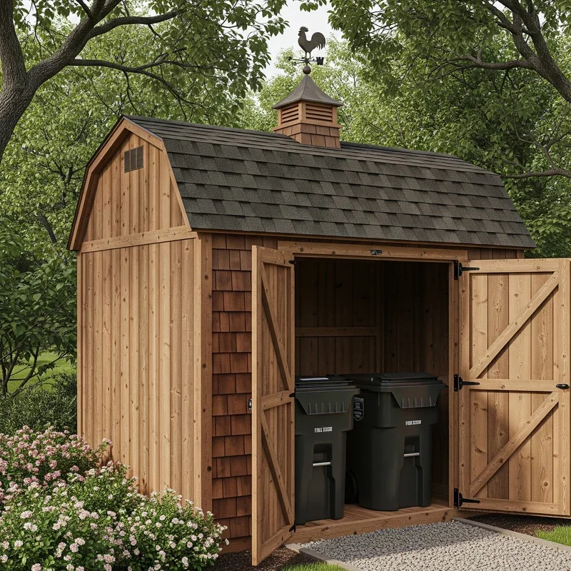 Channel your inner farmer with a miniature barn that makes garbage storage downright charming. This design works especially well for homes with rustic or farmhouse aesthetics, but honestly, who doesn't love a cute little barn? Build it with board-and-batten siding, add a peaked roof with shingles matching your house, and include those classic barn doors that slide or swing open. The whole project might set you back $500, but you're essentially adding a architectural feature to your property. Paint it classic red with white trim, or match your home's color scheme for a cohesive look. Some folks even add fake windows with flower boxes, because if you're going to store garbage, you might as well do it with maximum adorableness.