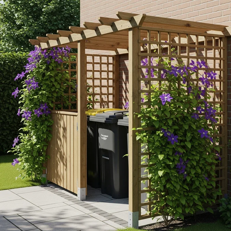 Combining a simple trellis structure with climbing plants creates a romantic, garden-inspired storage solution that gets more beautiful each year. Start with a basic wooden or metal trellis frame costing around $100, then plant climbing roses, honeysuckle, or wisteria at the base. These vigorous climbers will cover your structure in blooms and foliage, creating a living curtain that changes with the seasons. The fragrance from flowering vines can actually help mask any residual bin odors, which is a bonus nobody talks about. Maintenance involves occasional pruning and training the vines, but that's actually enjoyable garden work. By year three, you'll have a spectacular display that makes taking out the trash feel like walking through a secret garden.