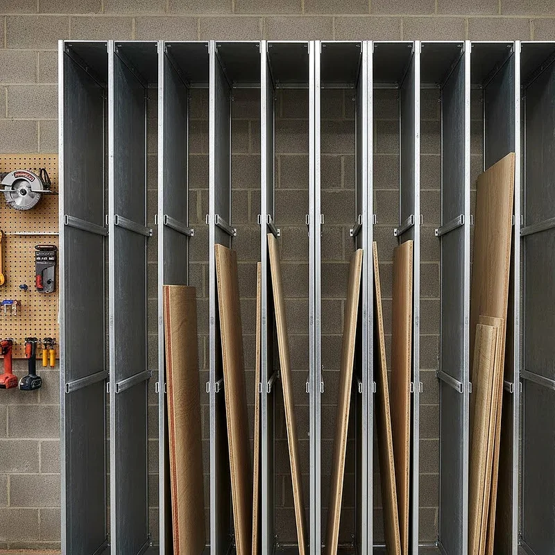A cantilever rack system provides professional-grade plywood storage using horizontal arms that extend from a vertical post structure without front column obstruction. This industrial-strength solution allows unimpeded access to stored materials since no vertical supports block the front loading area. The arms adjust vertically on the support columns, letting you customize spacing based on current inventory and accommodate various sheet thicknesses. Heavy-duty construction supports substantial weight loads, making this system suitable for commercial workshops with extensive material inventories. You'll appreciate how quickly you can slide sheets in and out without navigating around support posts or lifting over barriers. Installation requires solid anchoring to workshop floors or walls since the offset weight creates significant leverage forces on mounting points. This storage style delivers maximum accessibility and capacity for serious woodworkers who demand efficiency and organization in high-volume production environments.