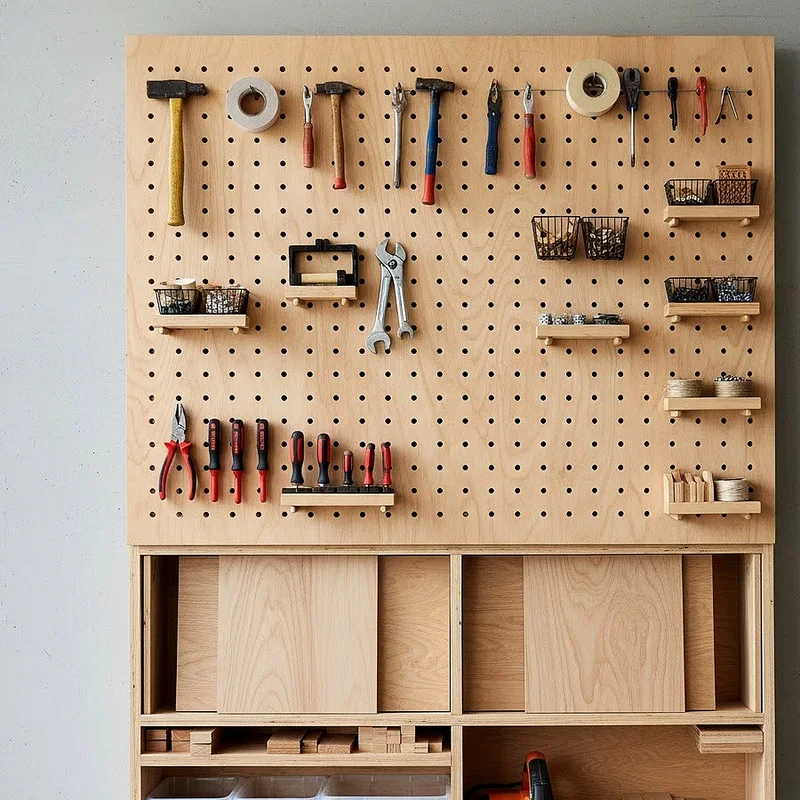 Pegboard panel organization extends beyond tool storage, offering creative solutions for managing plywood cut-offs and smaller sheet pieces through customizable hook configurations. This versatile system uses standard pegboard mounted to walls with appropriate standoff spacing, allowing hooks and brackets to support lightweight plywood pieces vertically. You can arrange hooks in patterns that accommodate your specific material sizes and shapes, creating a visual inventory that makes piece selection instantaneous. The system excels at storing template materials, jigs, and frequently used cut-off pieces that might otherwise pile up on workbench surfaces. Consider dedicating one pegboard section exclusively to current project materials, keeping everything needed for active work consolidated in one accessible location. The reconfigurable nature of pegboard systems means your storage evolves alongside changing project needs and material inventories. Your smaller plywood pieces finally have a designated home that keeps them organized and prevents valuable scraps from disappearing into workshop chaos.