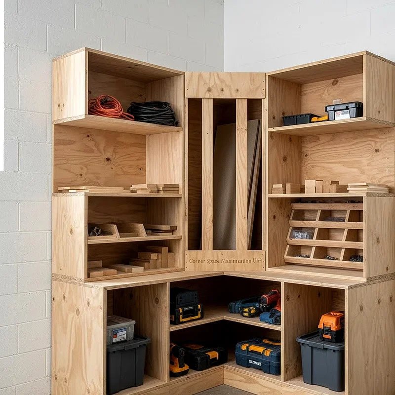 Corner space maximization units transform often-neglected workshop corners into productive plywood storage areas that efficiently use three-dimensional space. This specialized design features angled supports that fit snugly into corner configurations, with storage faces oriented at forty-five degrees to adjacent walls. The triangular footprint minimizes intrusion into central workshop floor space while providing surprising storage capacity for multiple full-size sheets. You can access stored materials from either adjacent wall side, offering flexibility in workshop layout and traffic flow patterns. Construction requires careful angle measurements to ensure proper fit, but the investment pays dividends in reclaimed usable space. Consider installing this storage type in multiple workshop corners to distribute material inventory and reduce carrying distances during projects. The corner orientation naturally protects stored sheets from incidental contact during normal workshop movement and activity.
