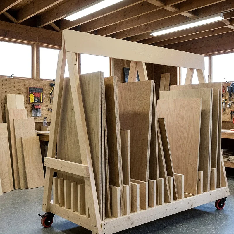 A portable dolly storage solution combines material transport and temporary storage in one mobile unit that adapts to dynamic workshop environments. This wheeled platform features raised edges or side supports that secure plywood sheets during movement while allowing quick loading and unloading. The compact footprint slides easily into narrow storage areas when not actively transporting materials, maximizing floor space efficiency. You can position dollies near cutting stations during active project phases, then roll them against walls when floor space becomes priority. Multiple dollies let you organize materials by project or material type, creating mobile storage clusters that move together through your workflow. The low-profile design requires minimal lifting when loading sheets, reducing physical strain and improving workplace safety. Your plywood becomes truly mobile rather than anchored in fixed storage locations, bringing materials to work areas instead of bringing work to storage.
