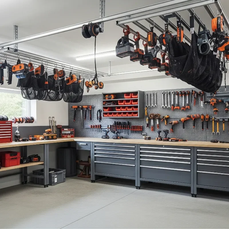 Why let all that ceiling space go to waste when it could be storing your power tools? Overhead systems maximize every cubic foot of your workshop, keeping tools accessible yet out of the way. Ceiling-mounted platforms, pulley systems, and track storage can hold everything from rarely used tools to seasonal equipment. I've installed adjustable height platforms that lower for easy access, then raise back up to clear headroom. Safety is paramount here: ensure your ceiling structure can handle the weight and always use proper mounting hardware. Consider clear storage bins so you can identify contents from below. LED lighting underneath platforms prevents shadowy corners. This solution works especially well for tools you use monthly rather than daily, freeing up prime real estate for everyday items.