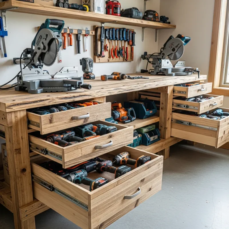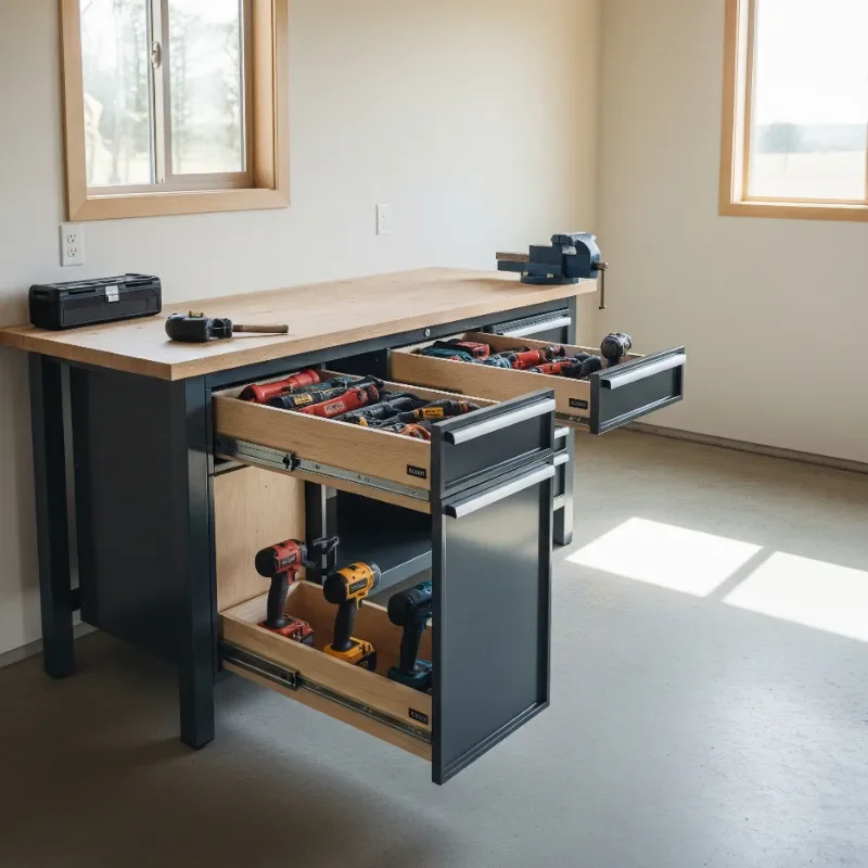Make every square inch count by transforming that dark cavity under your workbench into accessible storage paradise. Pull-out drawers or sliding trays bring tools from the depths into easy reach. Heavy-duty slides support even your beefiest power tools while gliding smoothly. I've installed multiple shallow drawers rather than deep ones, preventing the dreaded tool pile-up. Each drawer serves a specific category: sanders in one, drills in another. The key is measuring your tools first, then building drawers to fit. Add dividers to prevent sliding during movement. Soft-close mechanisms prevent jarring impacts that could damage tools. Label drawer fronts clearly for quick identification. Consider incorporating power strips in drawers for charging stations. This often-overlooked space can hold an surprising amount when properly organized. Your knees will appreciate not crawling around searching for tools