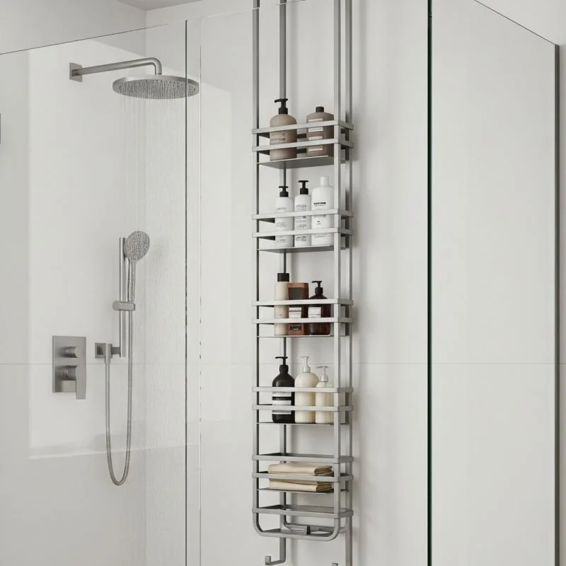 Maximize vertical space with tension pole caddies that stretch from tub rim to ceiling without any permanent installation. These adjustable organizers feature multiple shelves, baskets, and hooks accommodating everything from shampoo bottles to bath toys. The spring-loaded mechanism creates secure holds on flat ceilings without drilling or adhesives. Quality poles use rust-resistant materials and rubber ends protecting surfaces from damage. Adjustable shelf heights customize storage for different product sizes. Some models include towel bars and mirror attachments for added functionality. The corner placement keeps the pole out of shower traffic while maximizing storage capacity. Look for designs with wire baskets allowing water drainage and air circulation. Easy height adjustment means they grow with changing family needs. The portable nature makes them perfect for apartments or temporary living situations.