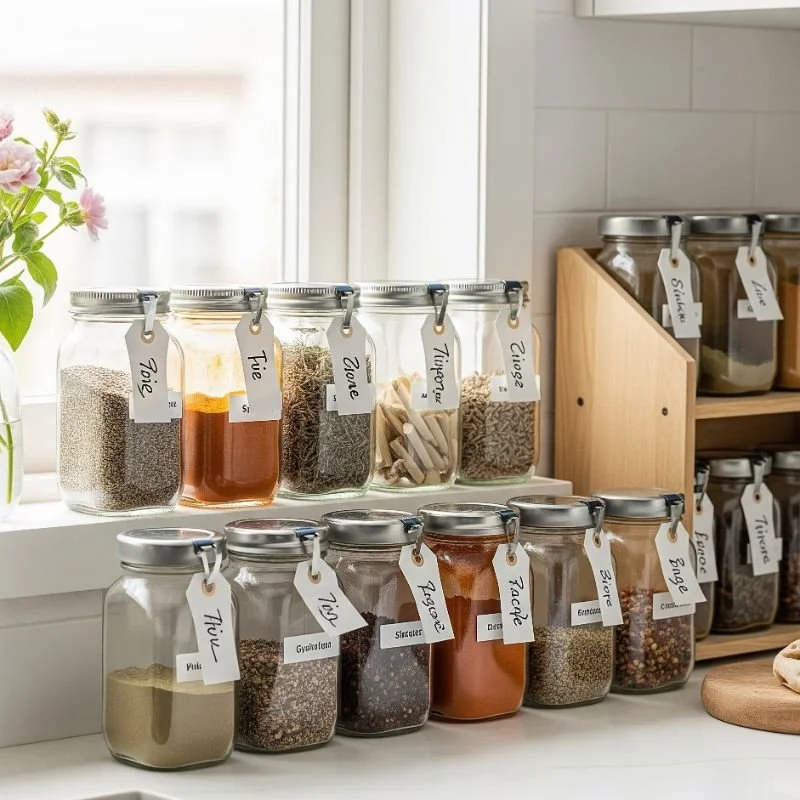 Create uniformity and elegance with matching glass jars that transform mismatched spice bottles into cohesive collections. These airtight containers preserve freshness while allowing easy identification of contents. Invest $40-100 in sets of 24-48 jars with various sizes. The transparency eliminates guessing games while uniform shapes maximize space efficiency. Choose between round jars for traditional looks or square ones for space-saving storage. Include waterproof labels with both common and scientific names for educational value. Airtight seals prevent moisture and air from degrading spices. This system encourages buying bulk spices, reducing packaging waste and costs. The aesthetic appeal makes open shelving possible without looking cluttered. Glass cleaning maintains visibility, though some prefer dark glass for light-sensitive spices. Transfer spices during low-humidity days preventing moisture trapping.