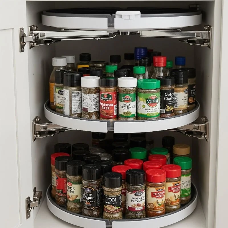 Spin your way to spice success with turntables that make every bottle accessible with a simple rotation. These rotating platforms work in cabinets, on counters, or inside pantries, eliminating the need to move bottles to reach others. Sizes range from 9-inch personal versions to 18-inch family-sized options, priced $10-40. The 360-degree access means no more knocking over bottles while reaching for back items. Choose models with raised edges preventing spills or divided sections for organization. Double-tier versions maximize vertical space while maintaining easy access. Non-slip bases keep turntables stable during use. This solution particularly suits corner cabinets where standard storage creates dead zones. Group spices by cuisine or use frequency on different turntables. The smooth spinning action makes cooking more efficient and enjoyable.