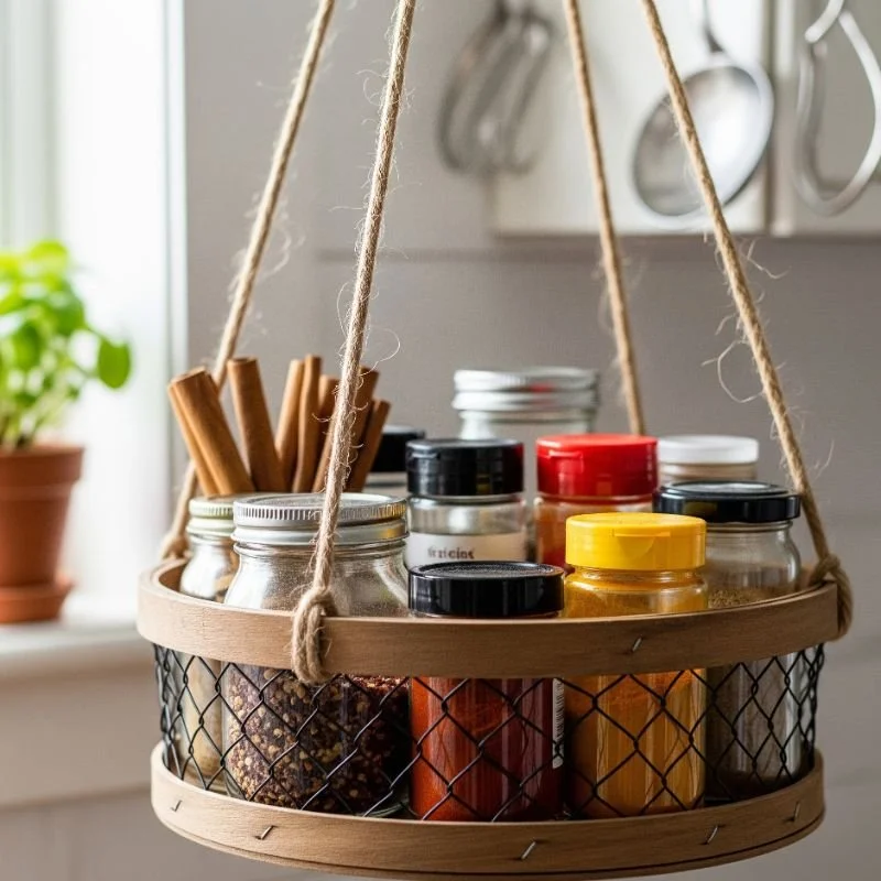 Suspend style and function with hanging baskets that utilize vertical space while adding rustic charm. Wire or woven baskets hung from ceiling hooks or under-shelf rails create accessible spice storage. Individual baskets cost $10-30, with complete systems running $50-150. The open design allows air circulation preventing moisture buildup while maintaining visibility. Hang at various heights creating visual interest while accommodating different users. Include labels on basket fronts for quick identification of contents. This method particularly suits kitchens with limited cabinet space but high ceilings. Choose baskets with flat bottoms preventing bottle tipping. The portable nature allows bringing entire baskets to cooking areas. Layer smaller baskets inside larger ones for categorized storage. Add S-hooks for easy repositioning based on seasonal cooking needs.