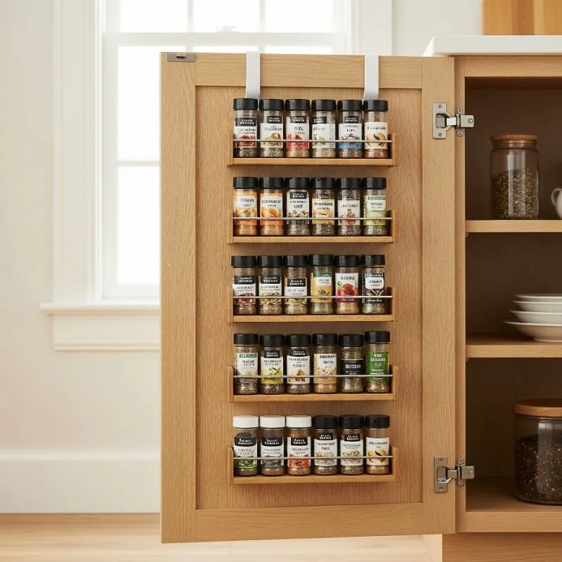 Turn neglected door space into prime spice real estate with racks that mount inside pantry or cabinet doors. These vertical organizers utilize otherwise wasted space while keeping spices at eye level. Options include wire racks ($20-50), wooden shelves ($30-80), or adjustable plastic systems ($25-60). Measure door clearance carefully to ensure shelves won't hit interior items when closing. Most hold 20-40 standard spice bottles depending on configuration. The door location means spices stay cooler than near stoves, preserving flavor longer. Install at comfortable heights avoiding excessive reaching or bending. Some designs include guards preventing bottles from falling during door movement. This solution doubles storage capacity without sacrificing shelf space for other pantry items. Choose sturdy mounting hardware supporting weight without sagging over time.