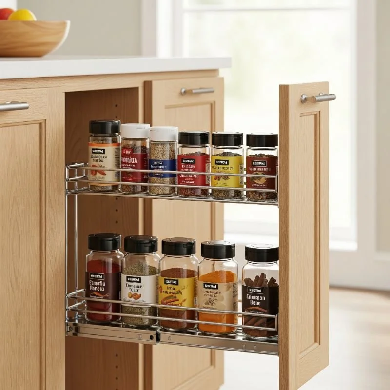 Install pull-down racks beneath upper cabinets for space-saving storage that brings spices to counter level. These mechanical systems mount hidden until needed, then lower smoothly for access. Professional installation costs $100-300, while DIY options run $50-150. The concealed design maintains clean kitchen lines while providing substantial storage. Weight ratings typically accommodate 20-30 pounds of spices and bottles. Choose models with adjustable shelves fitting various container heights. The lowering mechanism helps those unable to reach high cabinets comfortably. Include soft-close features preventing slamming and spills. This solution works especially well in galley kitchens with limited storage options. Position near food preparation areas for convenient access. Some models include built-in lighting illuminating spices when lowered. Regular mechanism maintenance ensures smooth operation for years.
