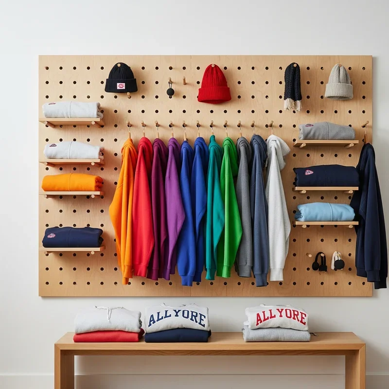 Transform blank walls into customizable sweatshirt displays using pegboard systems that adapt to changing storage needs! Paint pegboard to match room decor, then add hooks at various heights for hanging sweatshirts. This system displays hoodies like art while keeping them easily accessible and wrinkle-free. Adjust hook positions seasonally or as collection sizes change without permanent wall damage. Include baskets or shelves on pegboard for storing lightweight sweatshirts or accessories that complement hoodies. The vertical storage maximizes floor space while creating interesting visual displays that personalize rooms. This solution works brilliantly in dorms or rentals where permanent modifications aren't allowed but organization is essential.