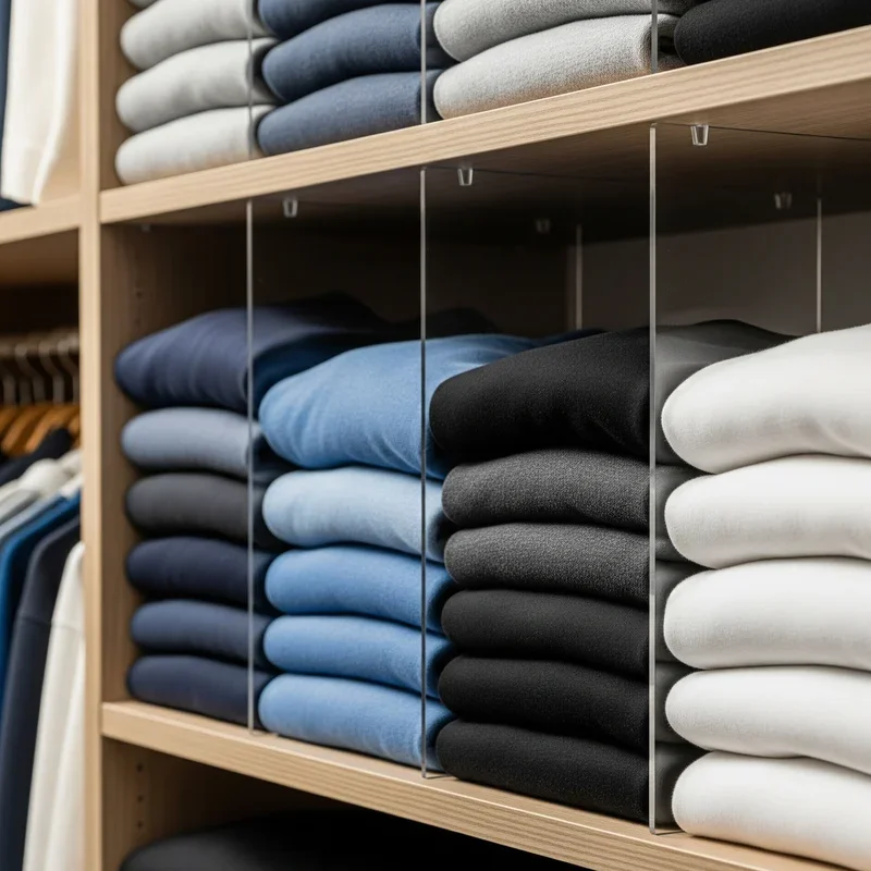 Install adjustable shelf dividers that create designated sweatshirt zones preventing toppling towers and maintaining organization long-term! These vertical separators slide onto existing shelves, creating individual compartments for different sweatshirt categories. Organize by color, weight, or frequency of use within each section for systematic storage. The dividers prevent sweatshirts from sliding and mixing when you pull one from the middle. Acrylic dividers offer visibility while wood or fabric ones add aesthetic appeal to open closets. This system works brilliantly for deep shelves where sweatshirts tend to get lost in back corners. Adjust divider spacing seasonally as your sweatshirt collection expands or contracts with weather changes.