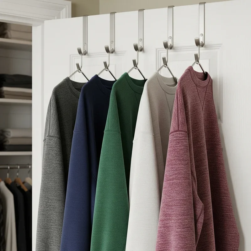 Transform the back of your closet or bedroom door into instant sweatshirt storage using over-the-door hooks! These simple additions require no installation and provide immediate hanging space for frequently worn hoodies. Choose sturdy metal hooks that support multiple sweatshirts without bending or breaking under weight. Position hooks at varying heights to accommodate different sweatshirt lengths and prevent dragging on floors. This solution keeps go-to hoodies accessible while freeing up precious closet rod space for other garments. The visible storage reminds you of options you might otherwise forget buried in drawers. Over-the-door organizers with multiple hooks can hold an entire week's worth of sweatshirts ready for grab-and-go convenience.