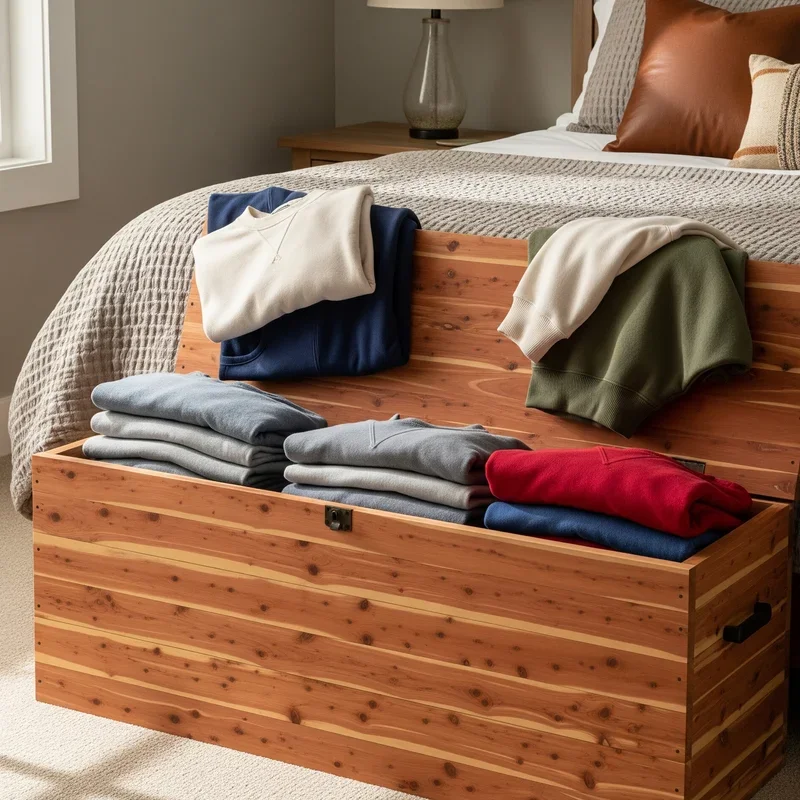 Invest in a cedar chest that provides protective storage while adding furniture functionality to bedrooms or entryways! Cedar naturally repels moths and insects while imparting a fresh scent that keeps sweatshirts smelling pleasant. The chest's deep storage accommodates numerous sweatshirts, perfect for seasonal rotation or special occasion hoodies. Use tissue paper between delicate sweatshirts to prevent color transfer and maintain pristine condition during storage. The flat top doubles as seating or display surface, maximizing room functionality beyond simple storage. Position chests at foot of beds or under windows for convenient access while enhancing room aesthetics. This heirloom-quality solution provides decades of reliable storage while becoming cherished furniture pieces.