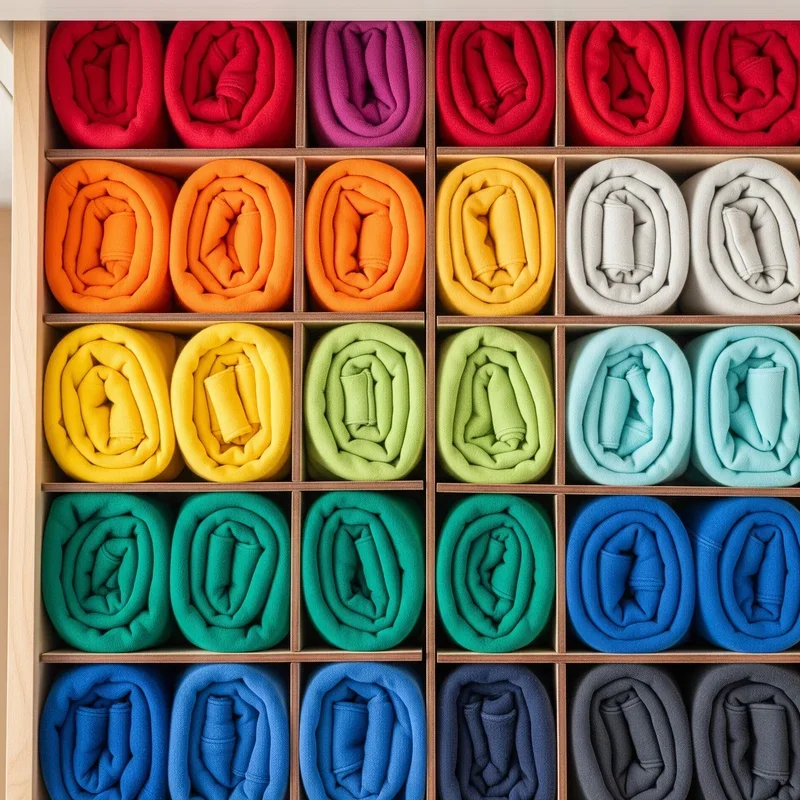 Organize sweatshirts by color creating rainbow displays that make selection intuitive while adding visual appeal to storage! Arrange from light to dark or group similar hues together for cohesive organization systems. This method speeds morning decisions by highlighting color options that match intended outfits easily. The visual organization encourages wearing forgotten sweatshirts by making all options equally visible. Color coding works with any storage method from hanging to folding or rolling techniques. Include a miscellaneous section for multicolored or patterned sweatshirts that don't fit neat categories. This aesthetically pleasing system maintains itself naturally since returning sweatshirts to correct color zones becomes automatic.